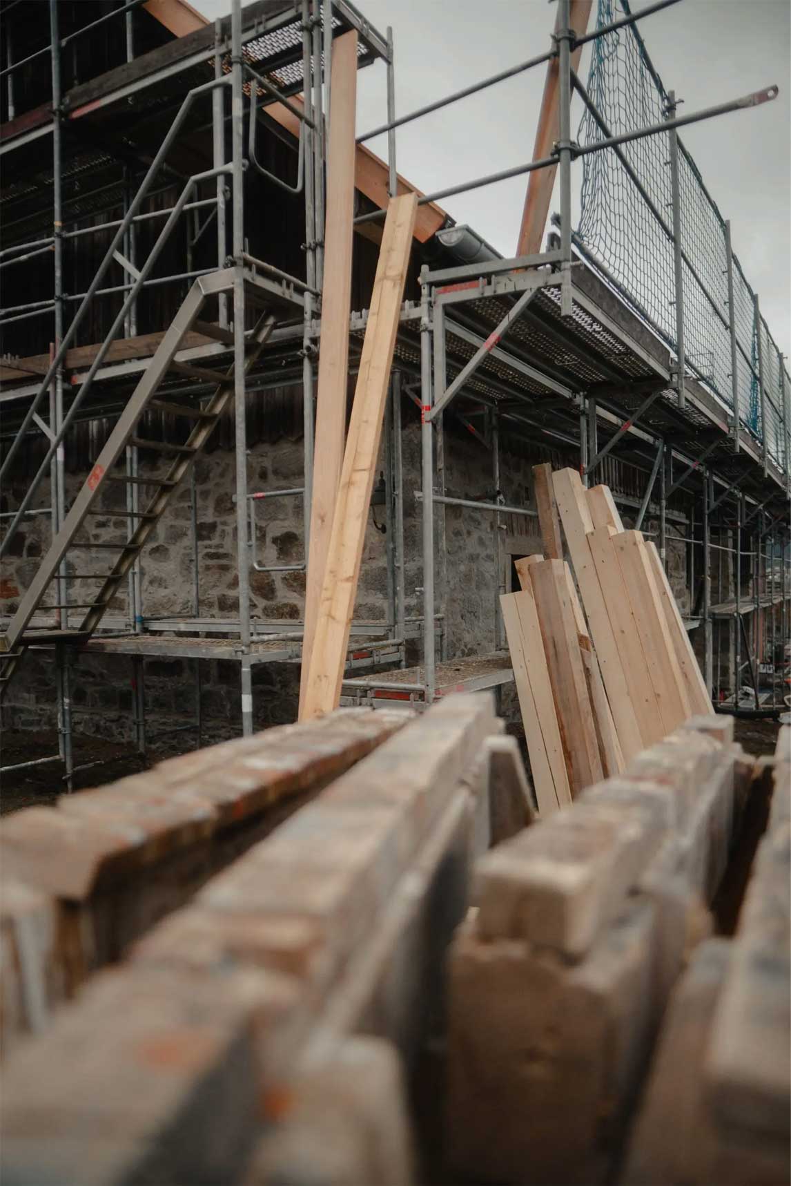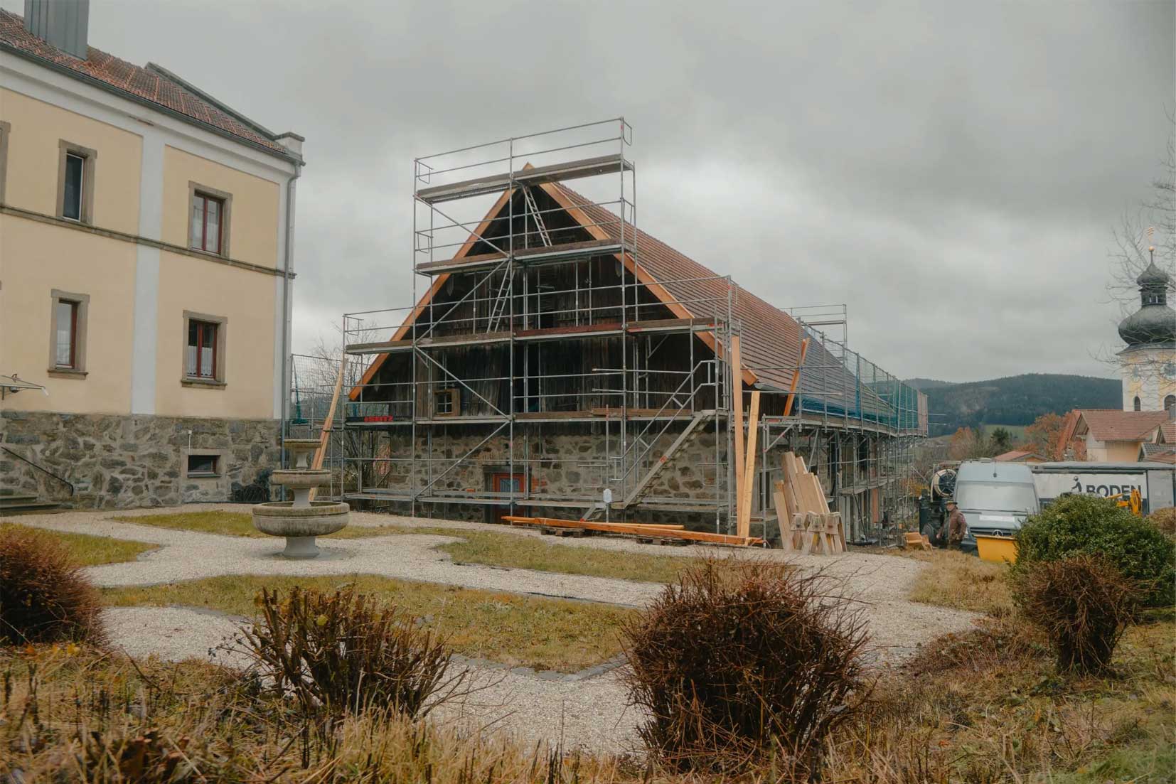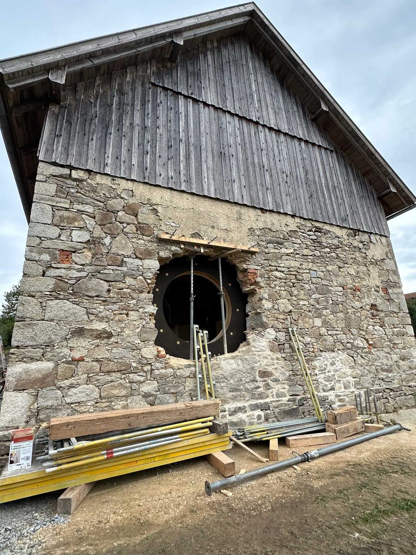 - Notabsicherung des ehemaligen Kuhstalls: Schutz der Substanz für die kommenden Bauphasen.