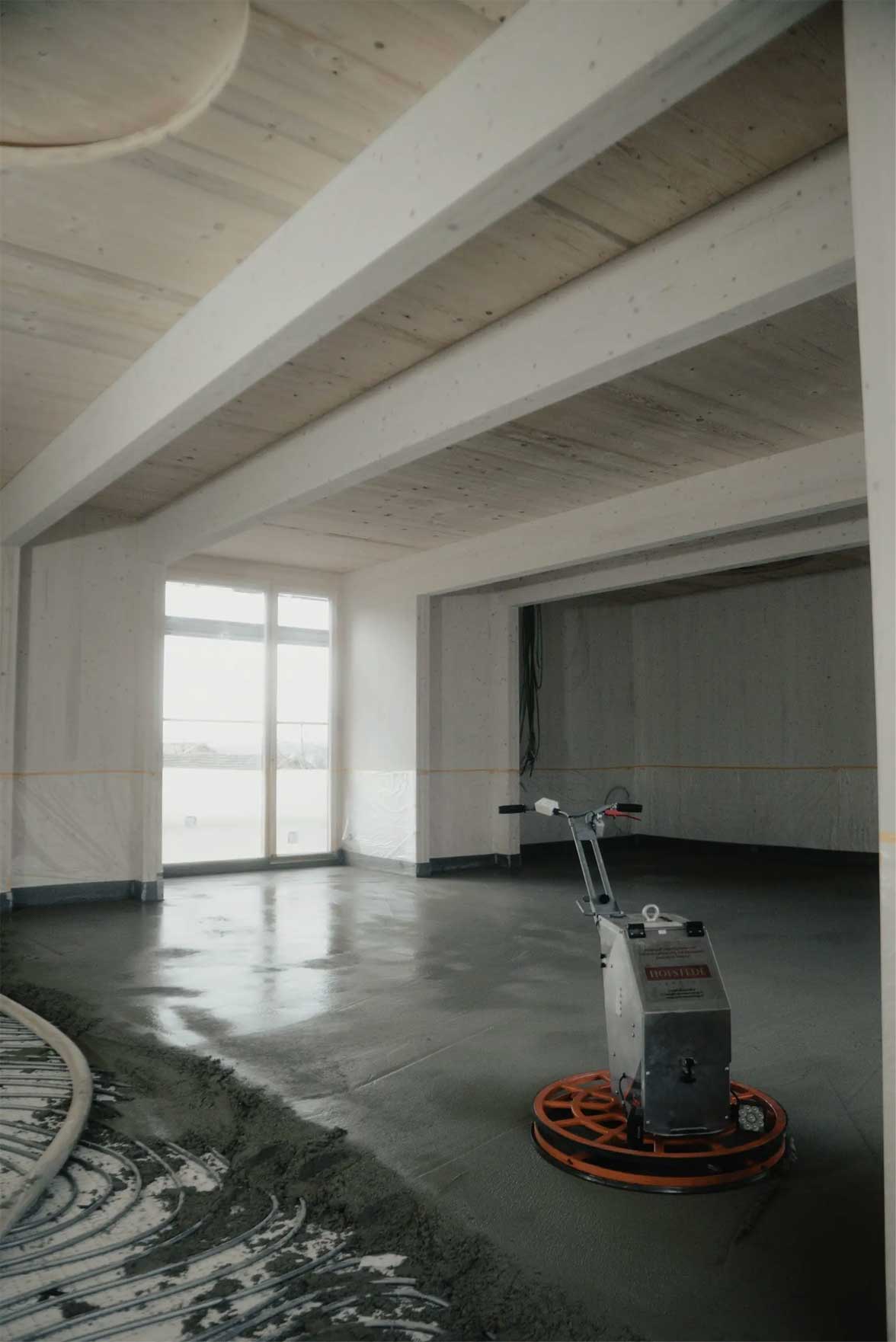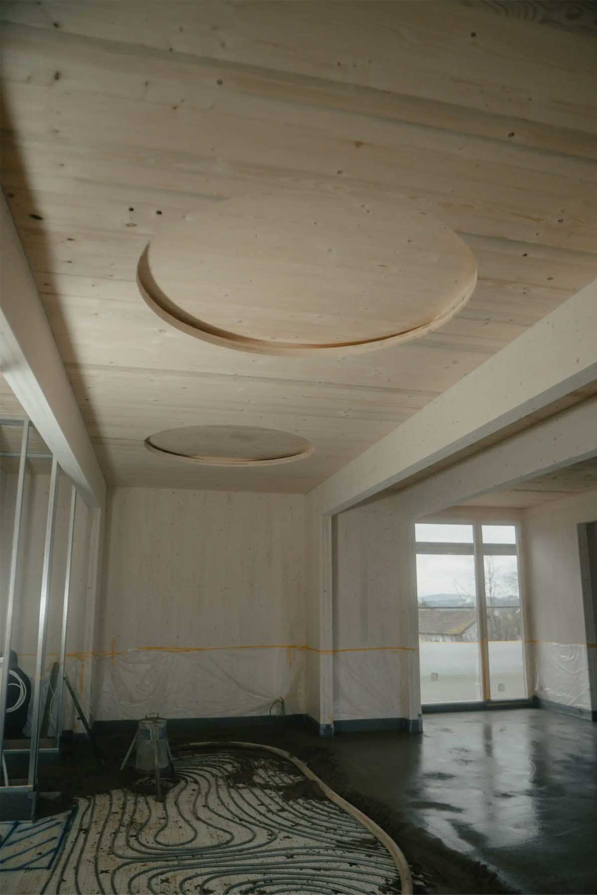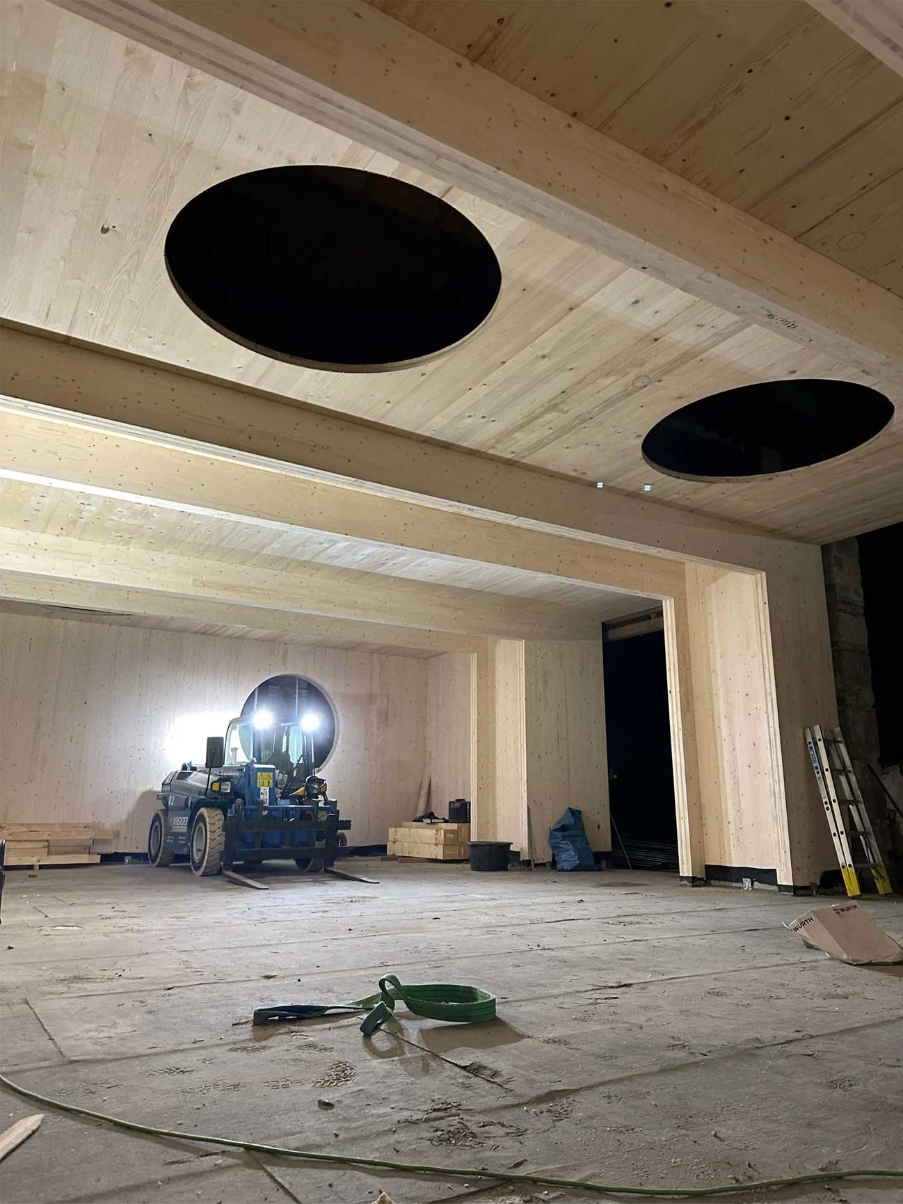 - Einbau eines „Hauses im Haus“: Mit gedämmten Brettsperrholzelementen in hochwertiger Sichtqualität.