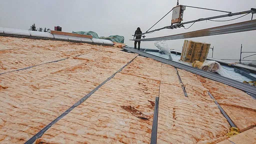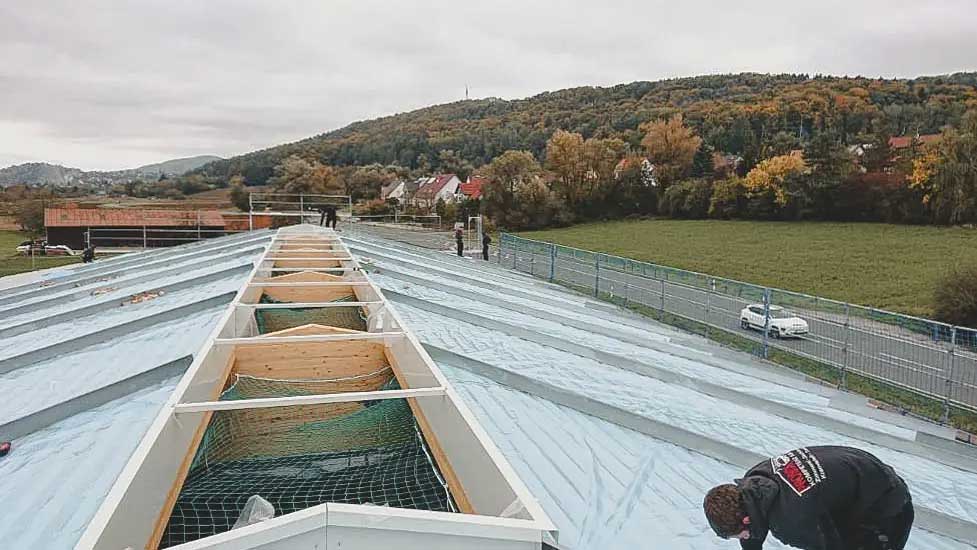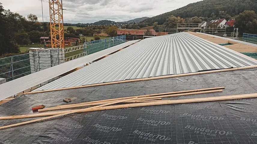 Dacheindeckung mit Trapezblechen: Die Dacheindeckung mit Tragprofilen, Mineralwolldämmung und Trapezblechen bietet den besten Wetterschutz und sorgt dafür, dass die Werkstatt bei allen Witterungsbedingungen zuverlässig nutzbar bleibt.