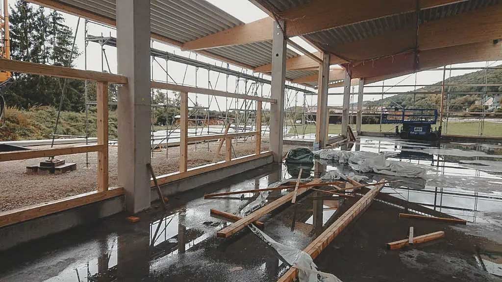 Holzhallenkonstruktion mit Satteldachbindern: Die robuste Struktur wurde in enger Zusammenarbeit mit unserem Systempartner Haas Fertigbau aufgestellt. Die Verwendung von Holz sorgt nicht nur für eine hohe Stabilität, sondern auch für eine nachhaltige Bauweise.