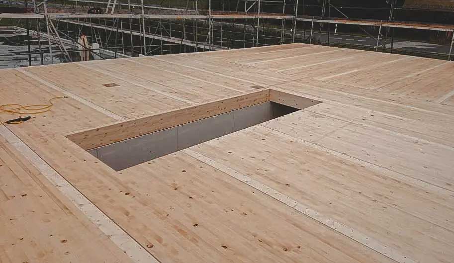 Brettstapeldecke und Dachstuhl: Die Brettstapeldecke sorgt für eine stabile Tragfähigkeit, während der Dachstuhl des Bürogebäudes sorgfältig ausgeführt wurde, um eine langlebige und sichere Dachkonstruktion zu gewährleisten.